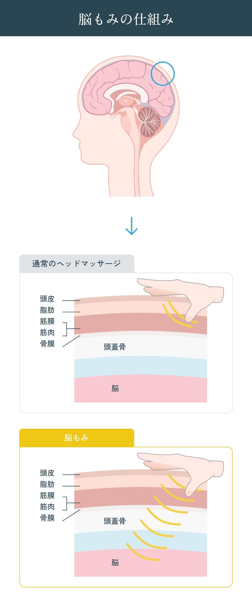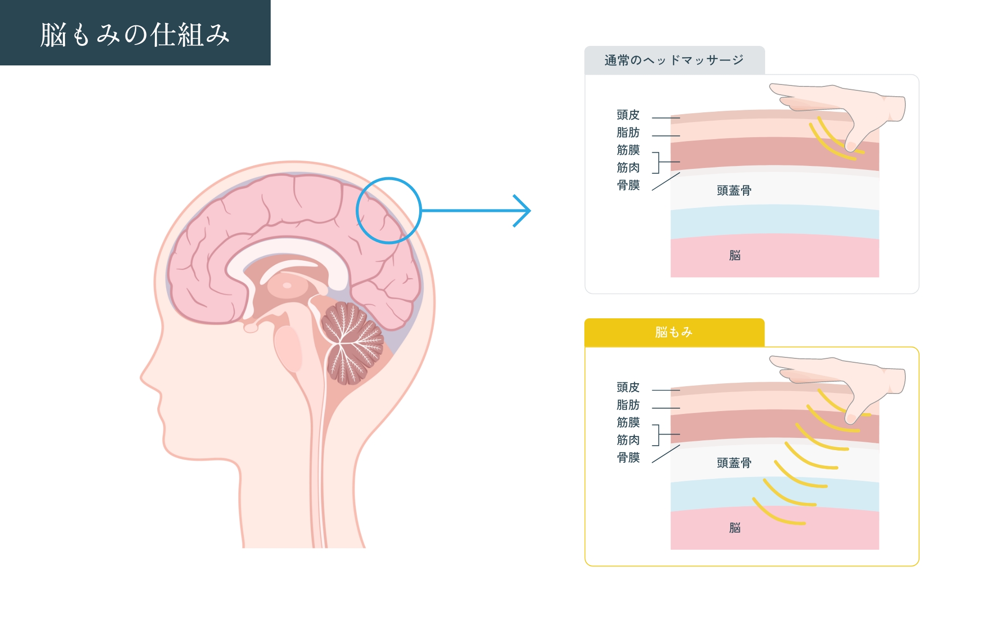 一般的なヘッドスパは、表層の筋肉だけをゆるめる施術が多い中、“脳もみ™︎nomomi”は脳の奥深くまで届ける施術で、